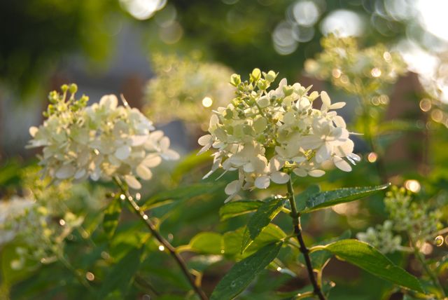 | And behind the towering meadow rue are three white hydrangeas, Hydrangea paniculata 'Limelight'. It is hardy in zones 3-9 and its flowers increase in size as the bush grows larger. |